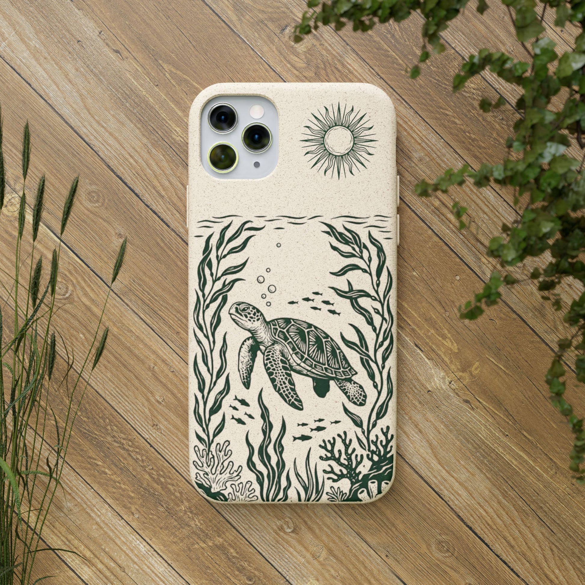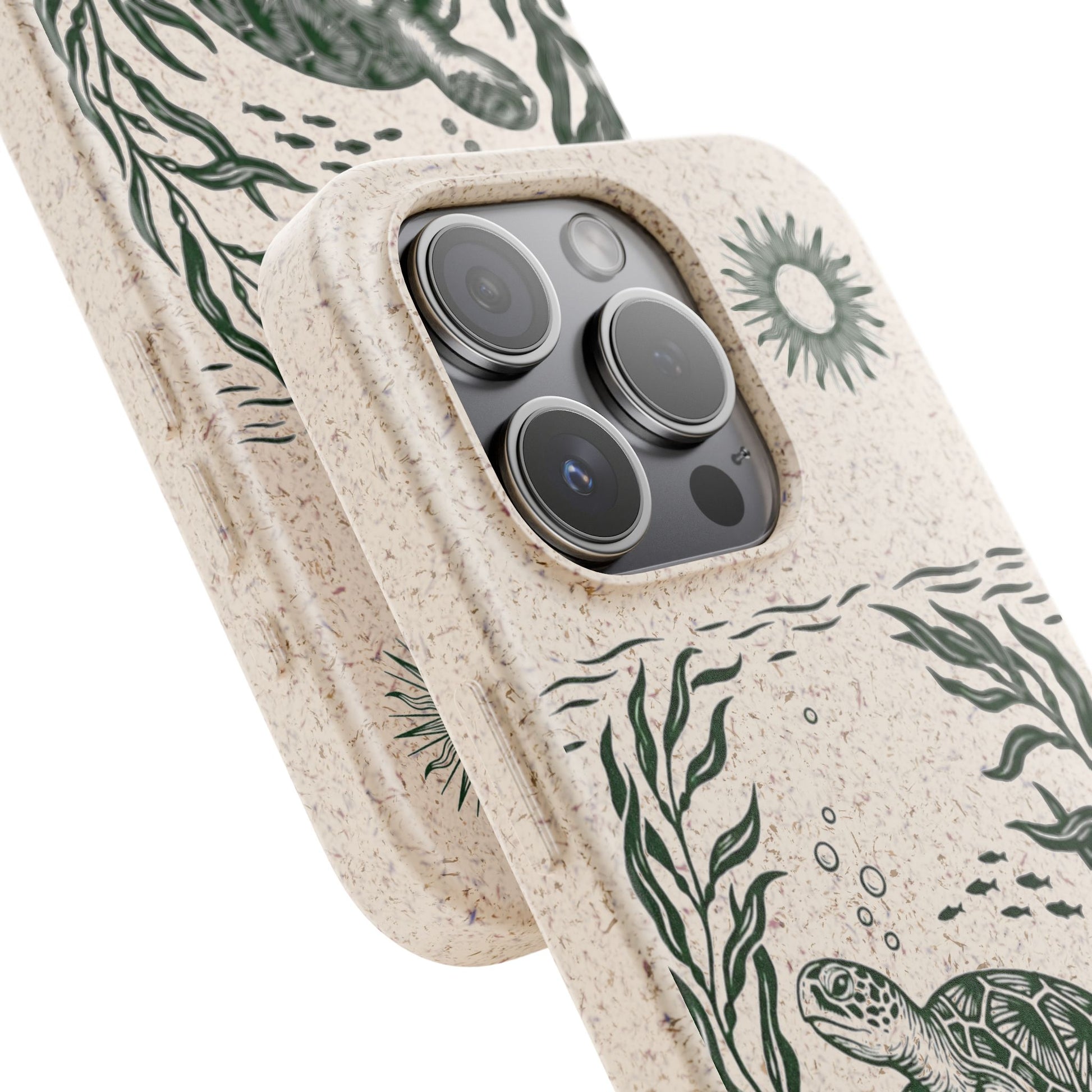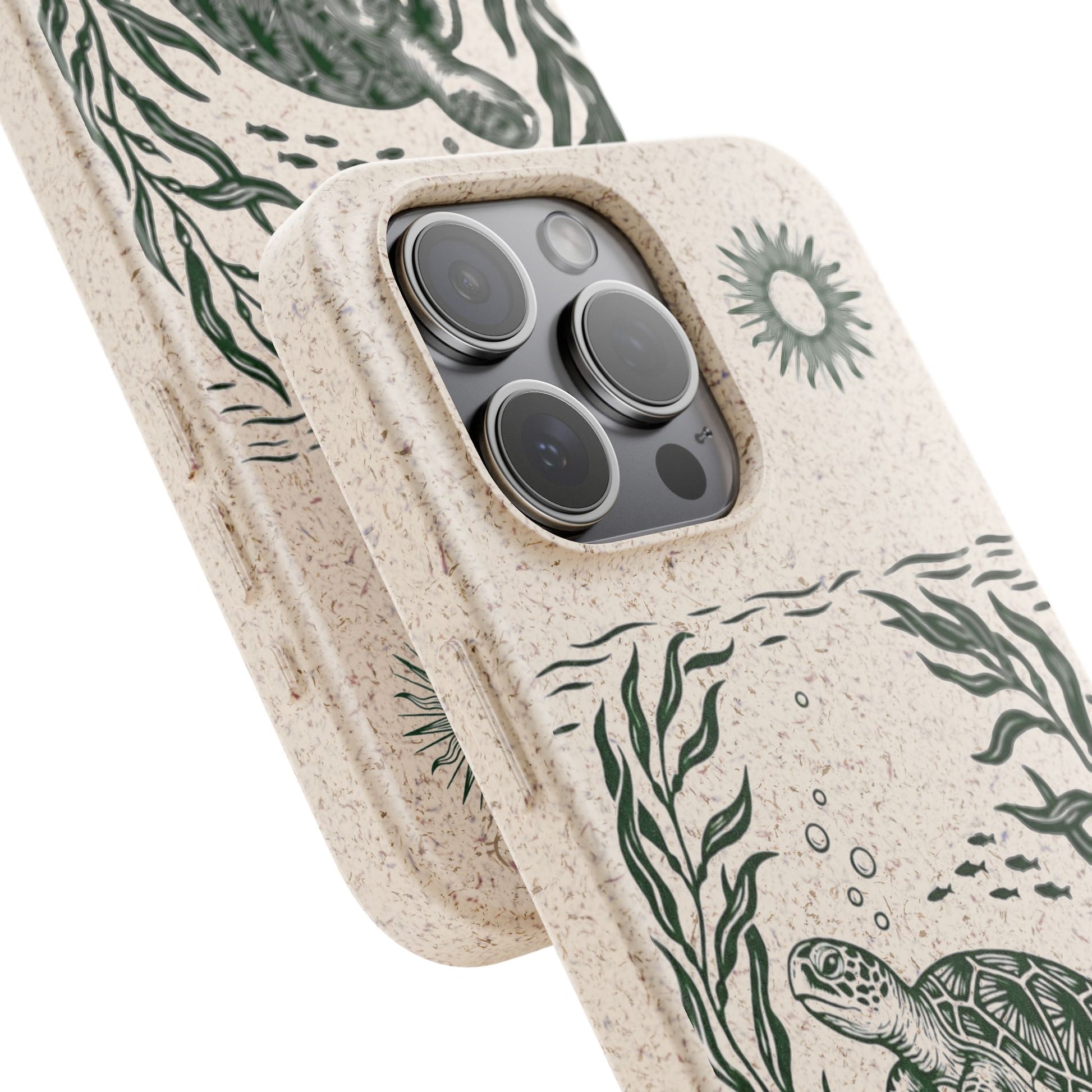 Trasforma il tuo iPhone in un piccolo atto di tutela dell'oceano. Questa Cover Originale non è solo protezione, è un'immersione nella natura. Caratterizzata dal design "Tartaruga & Sole", presenta una scena marina incisa in verde profondo: una tartaruga che nuota tra alghe fluttuanti e pesciolini, illuminata da un sole radioso. La superficie opaca e naturale esalta il disegno, ricordandoci la bellezza fragile dei nostri mari.