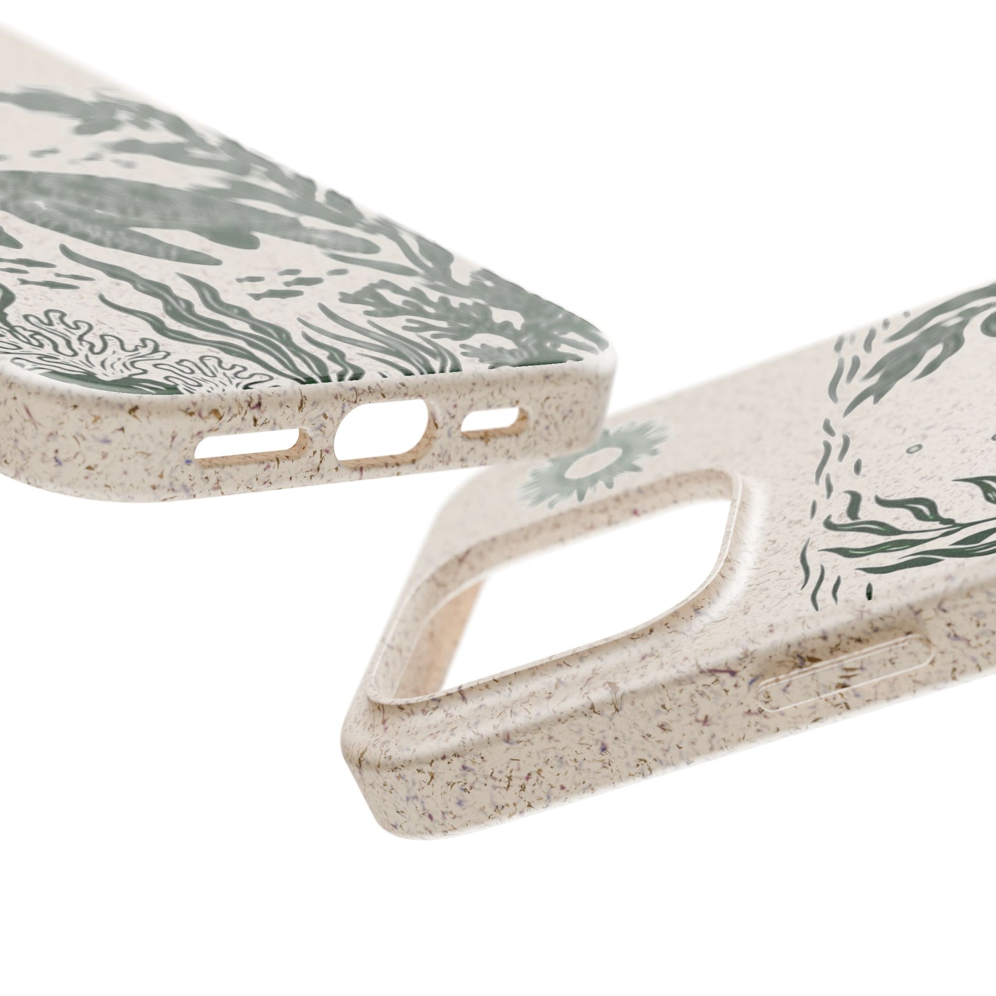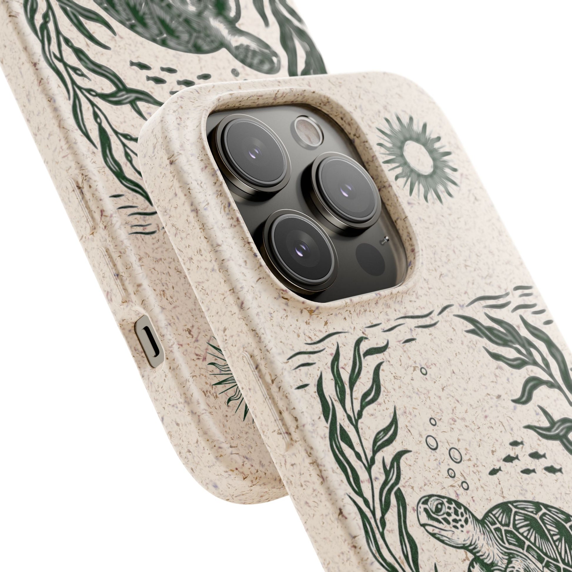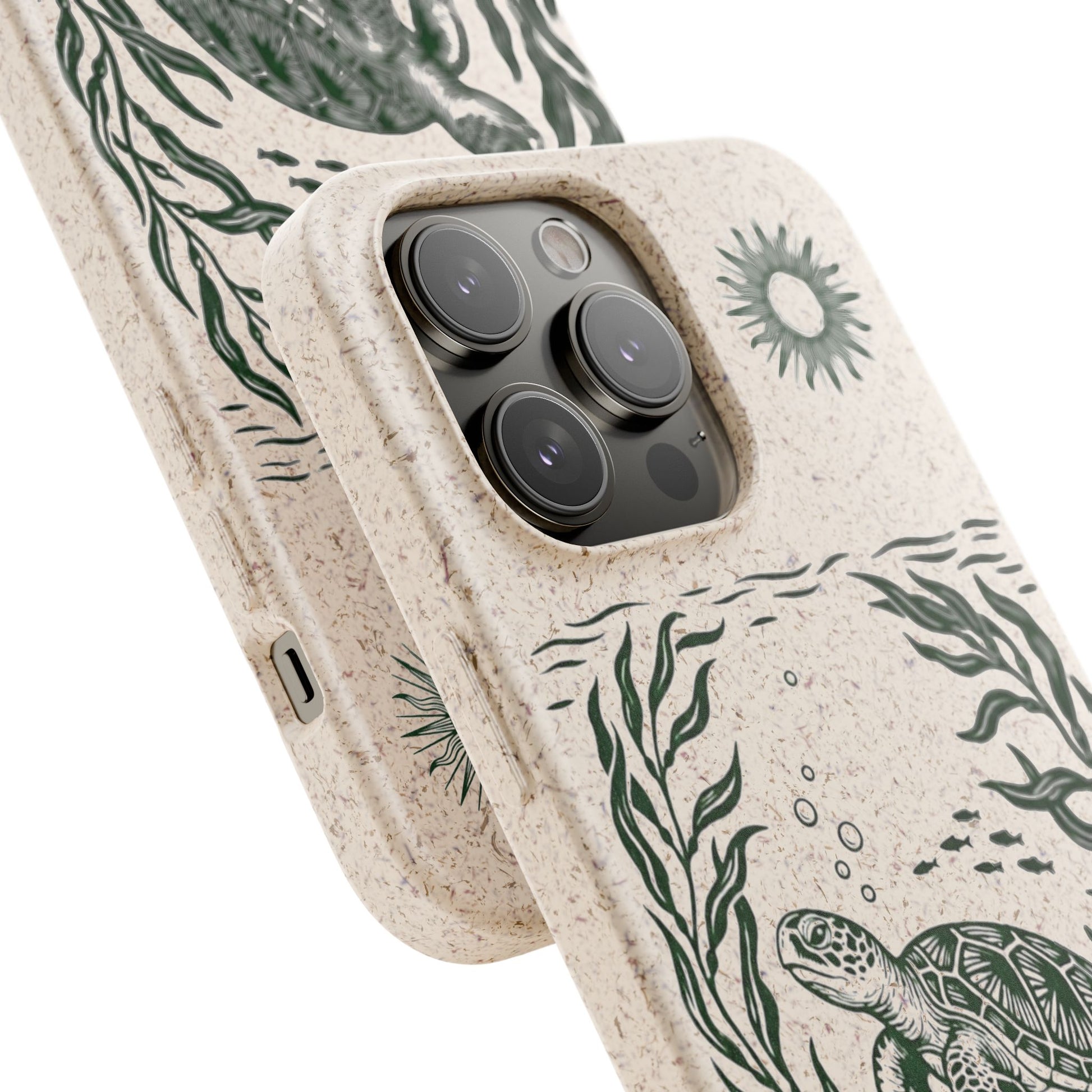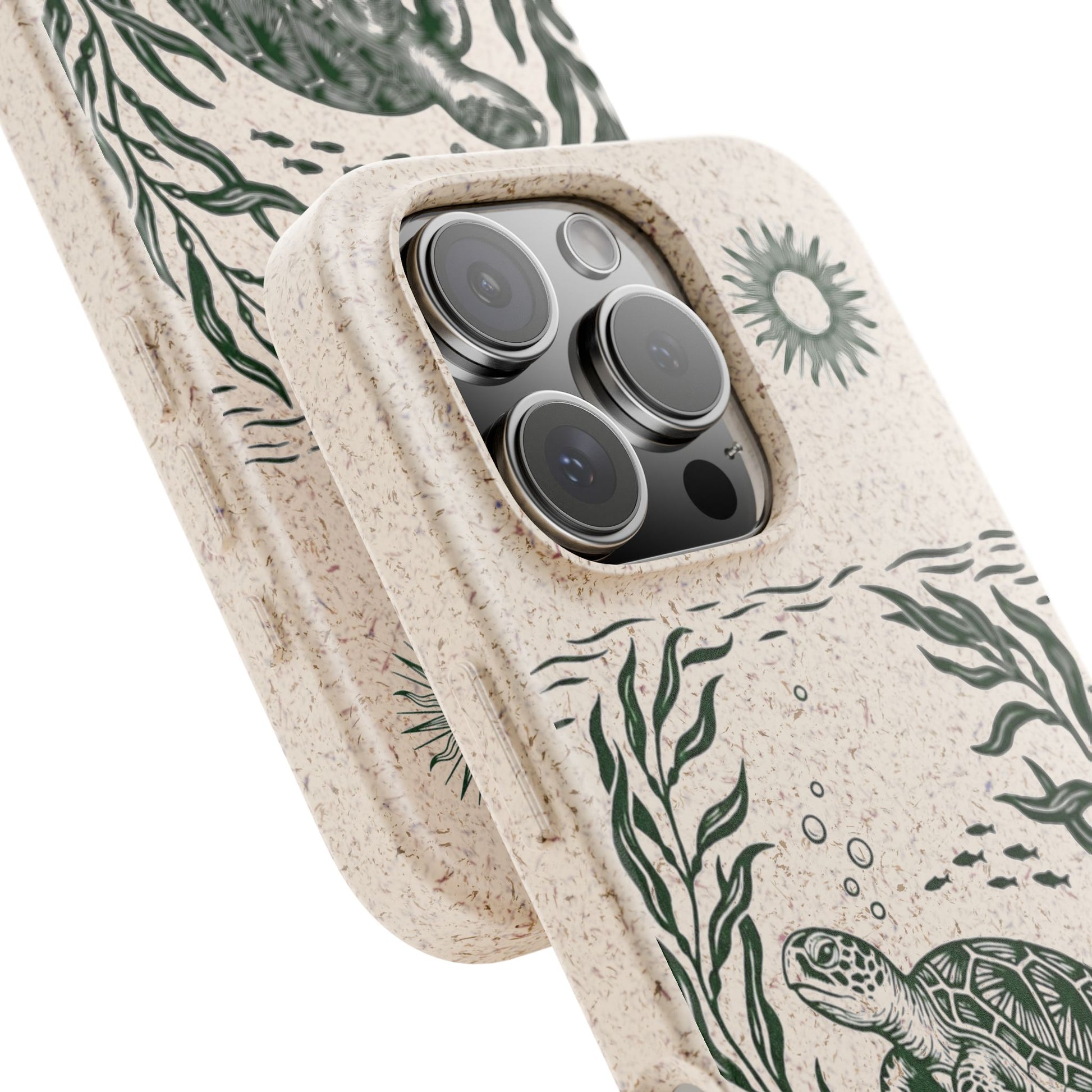 Trasforma il tuo iPhone in un piccolo atto di tutela dell'oceano. Questa Cover Originale non è solo protezione, è un'immersione nella natura. Caratterizzata dal design "Tartaruga & Sole", presenta una scena marina incisa in verde profondo: una tartaruga che nuota tra alghe fluttuanti e pesciolini, illuminata da un sole radioso. La superficie opaca e naturale esalta il disegno, ricordandoci la bellezza fragile dei nostri mari.