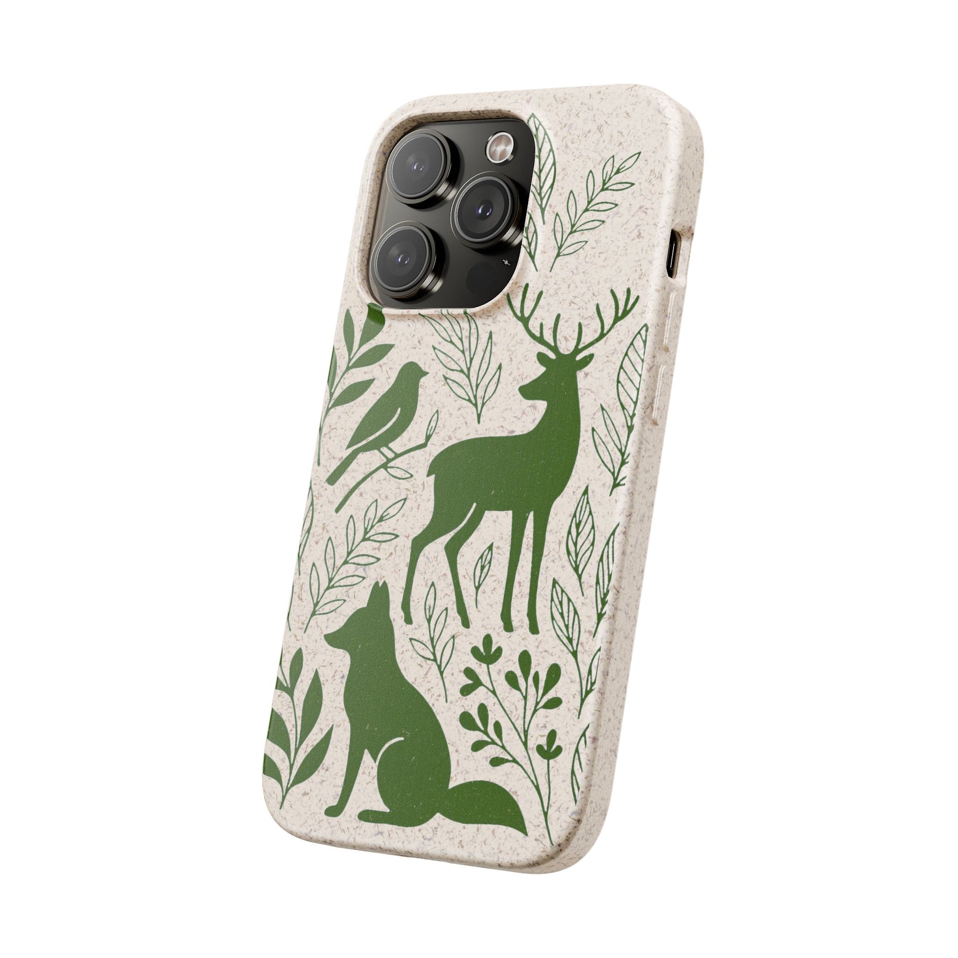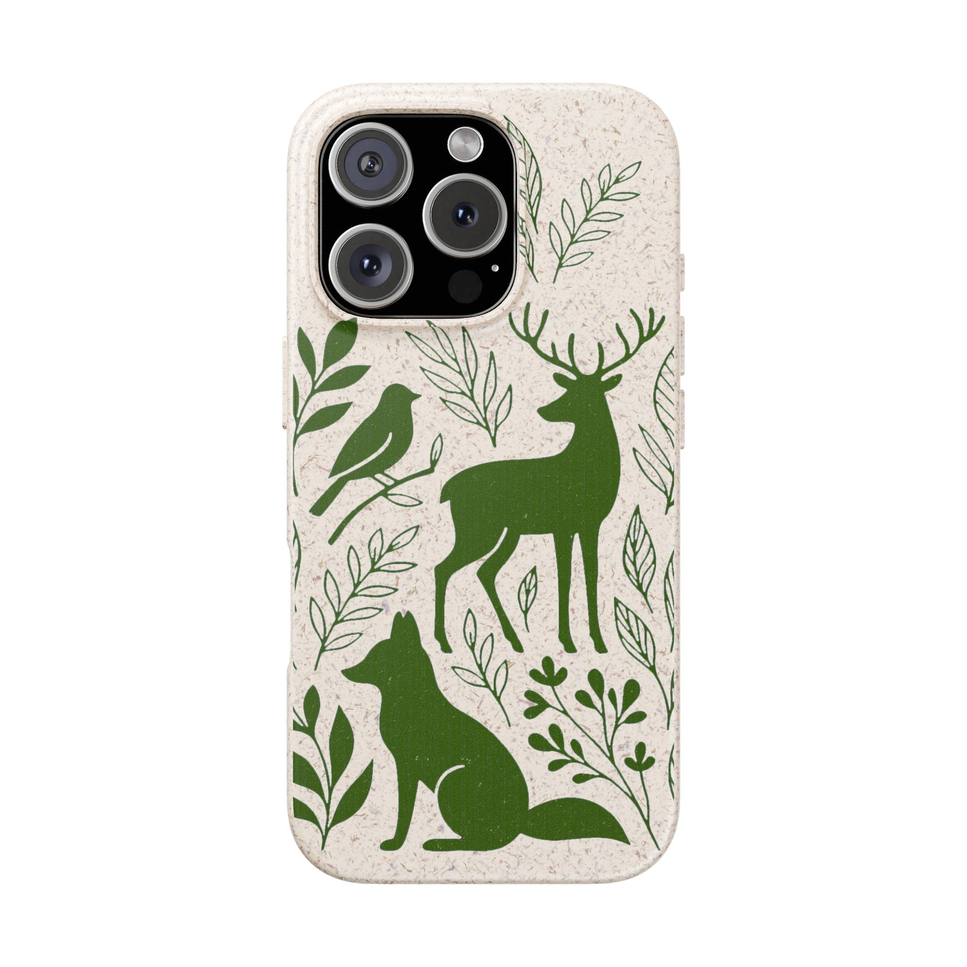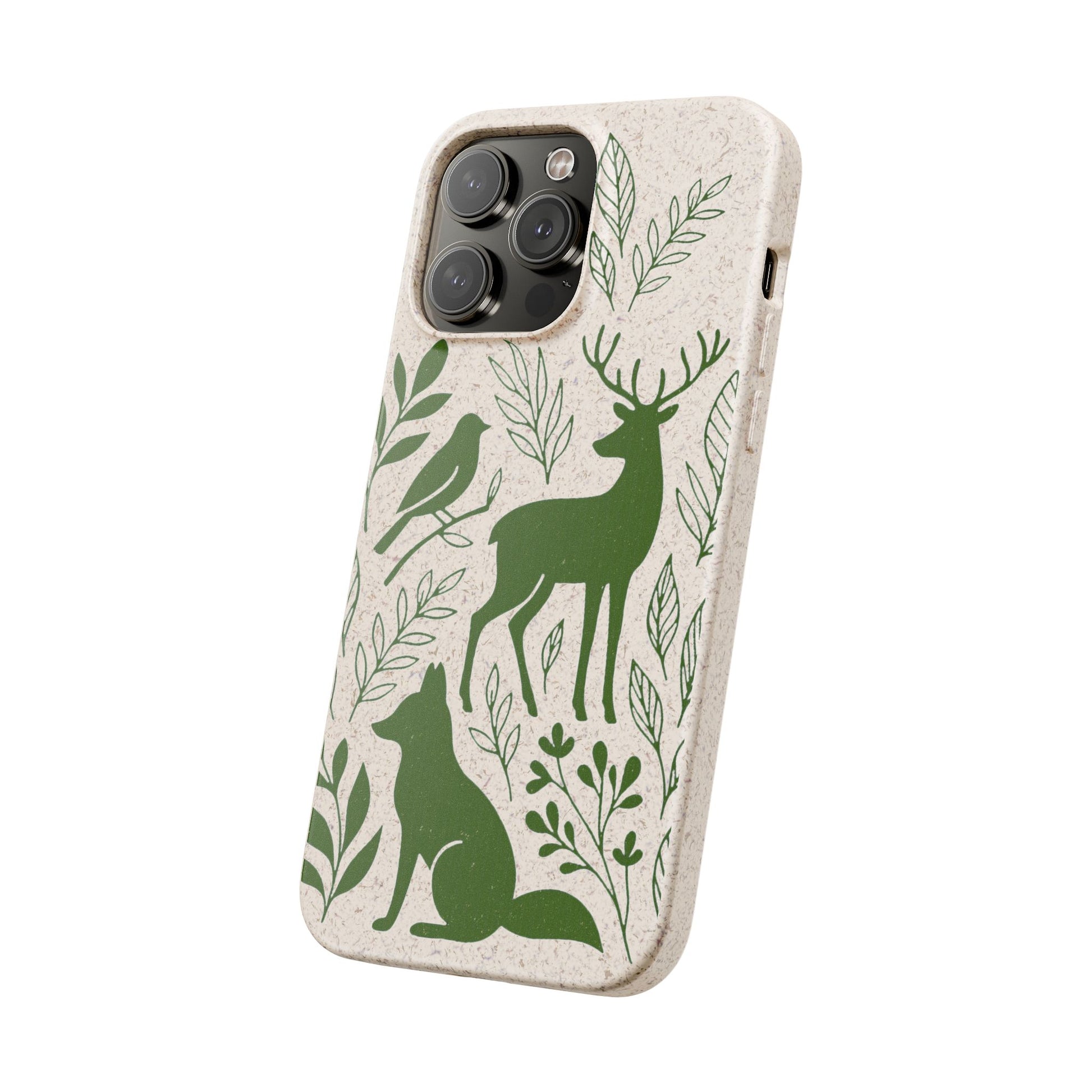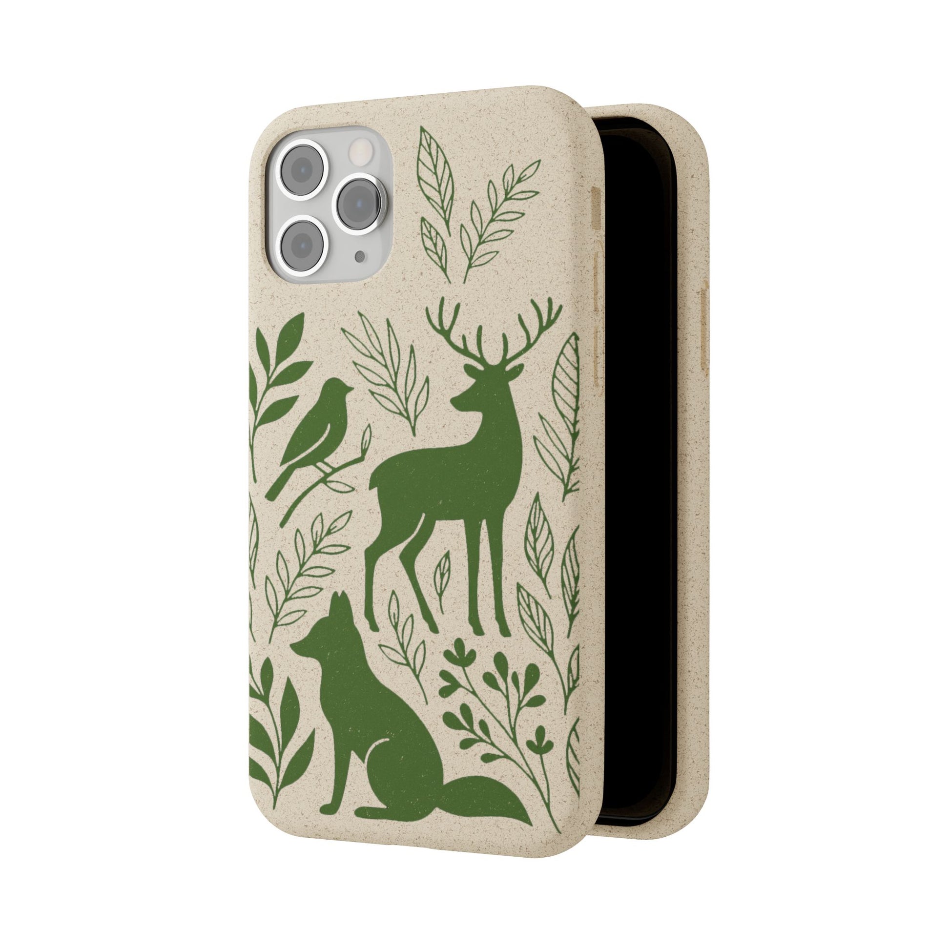 Porta con te lo spirito tranquillo del bosco, proteggendo il tuo telefono e il pianeta. Questa Cover Originale non è solo un accessorio, è un manifesto di gentilezza verso la natura. Caratterizzata dal design "Animali del Bosco", presenta le silhouette delicate in verde oliva di un cervo, una volpe e un uccellino immersi nel fogliame. Il disegno si fonde con la texture naturale del materiale, donando un tocco di autentica quiete alla tua giornata.