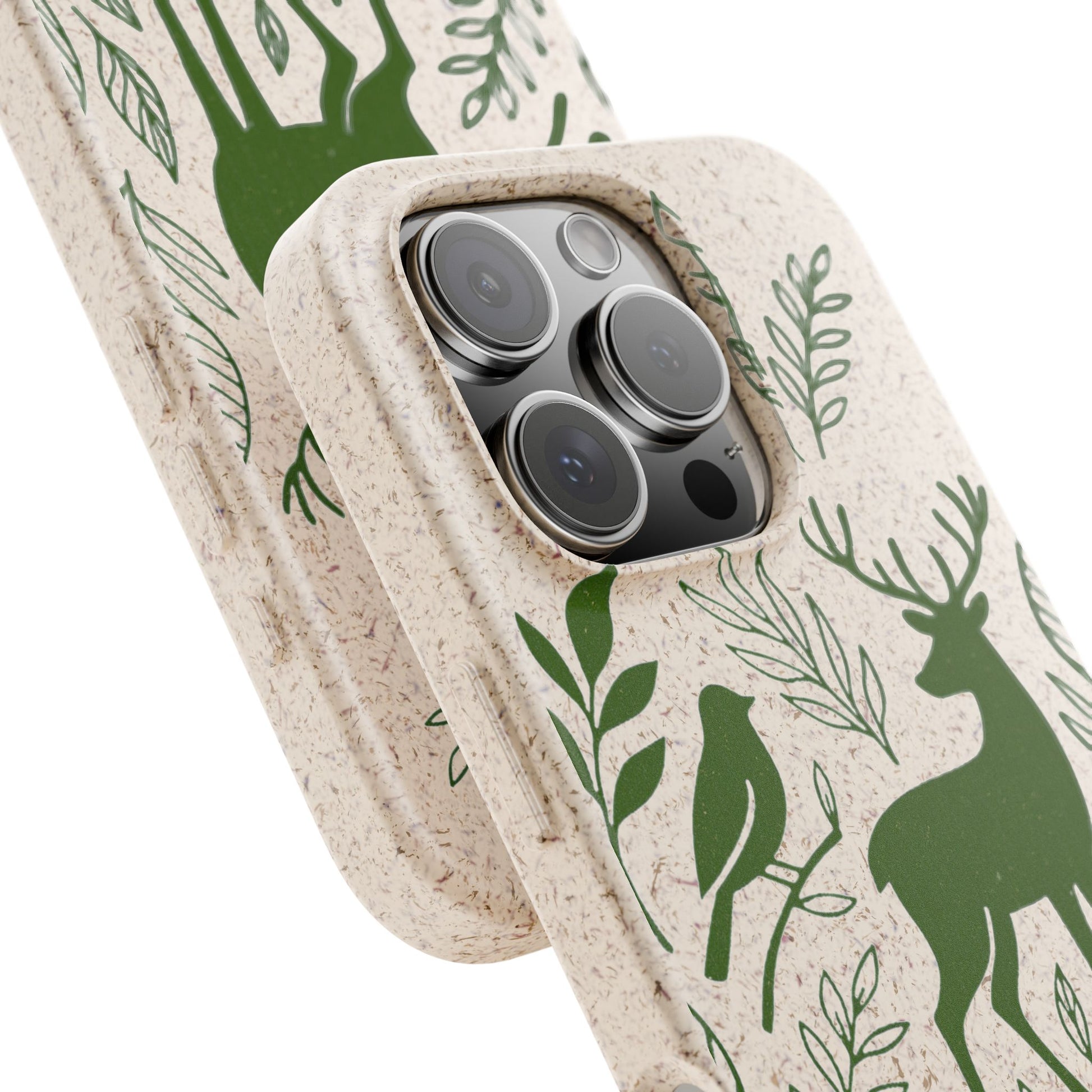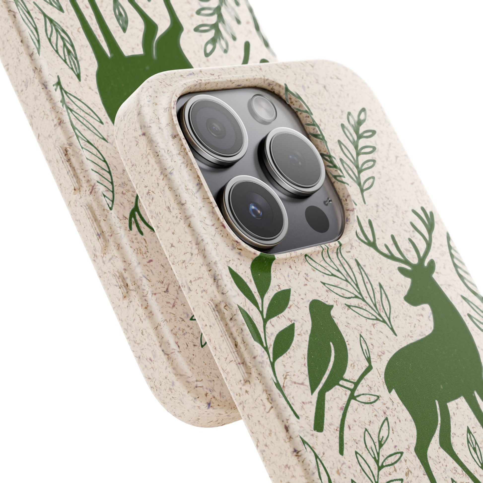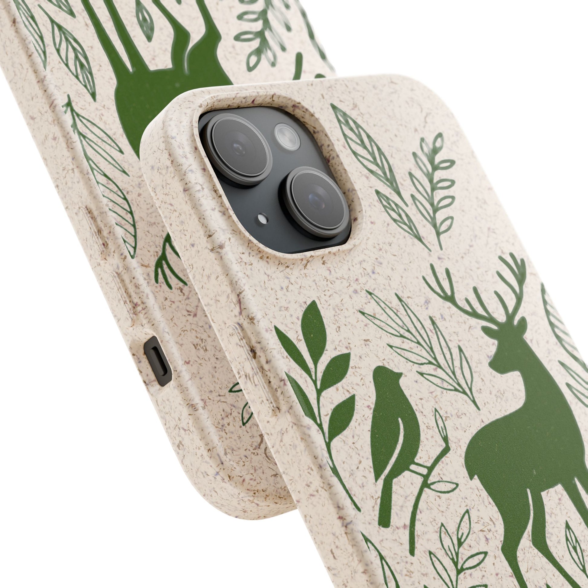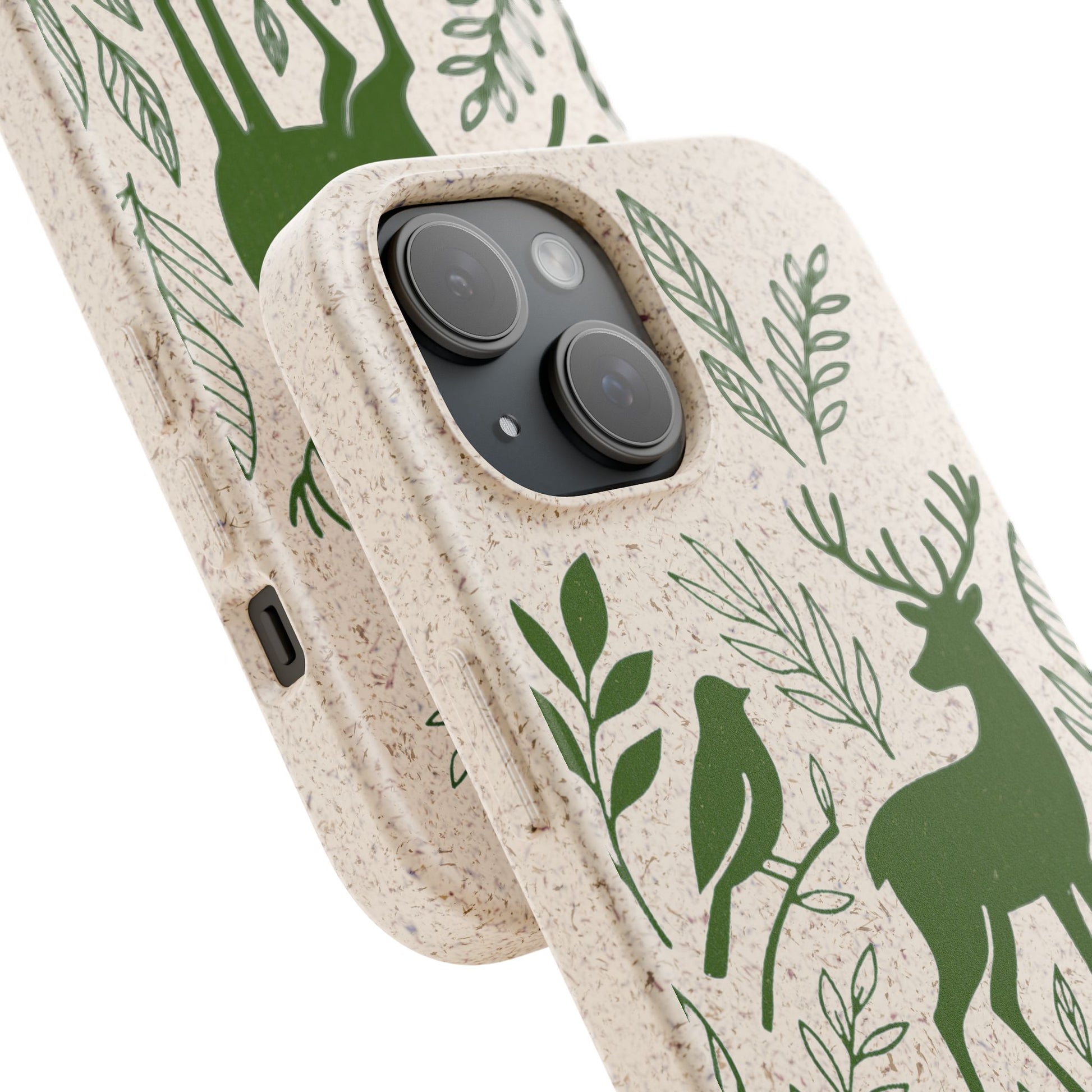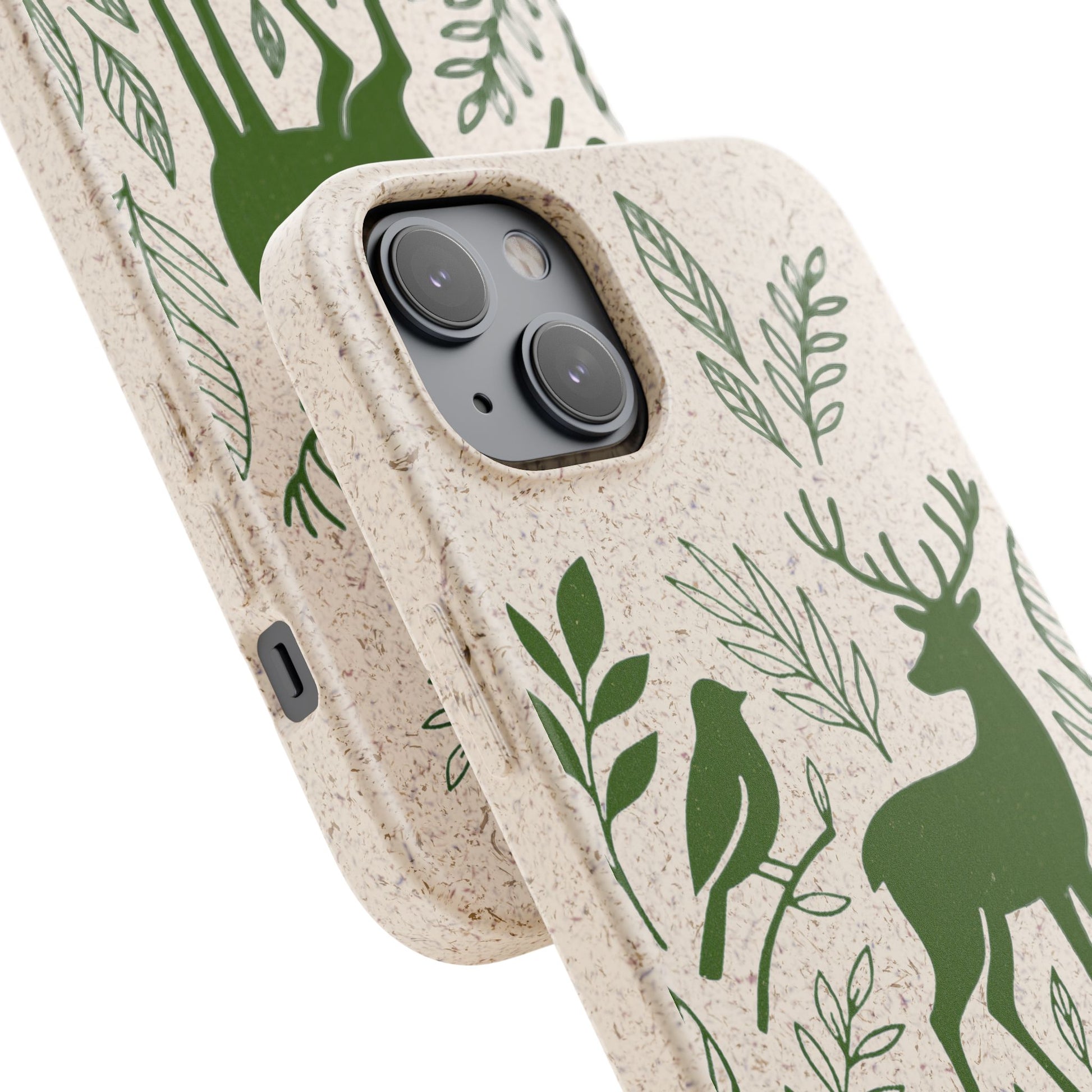 Porta con te lo spirito tranquillo del bosco, proteggendo il tuo telefono e il pianeta. Questa Cover Originale non è solo un accessorio, è un manifesto di gentilezza verso la natura. Caratterizzata dal design "Animali del Bosco", presenta le silhouette delicate in verde oliva di un cervo, una volpe e un uccellino immersi nel fogliame. Il disegno si fonde con la texture naturale del materiale, donando un tocco di autentica quiete alla tua giornata.